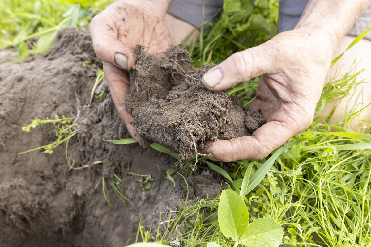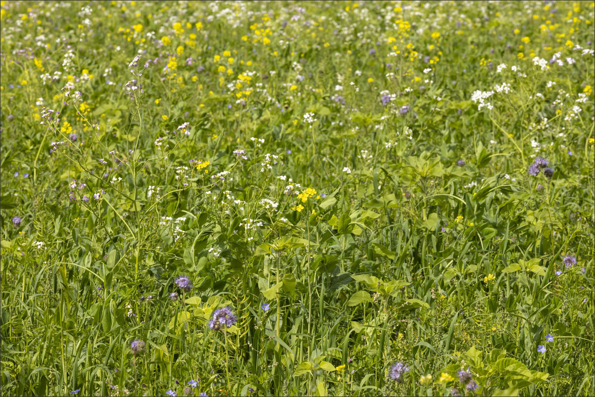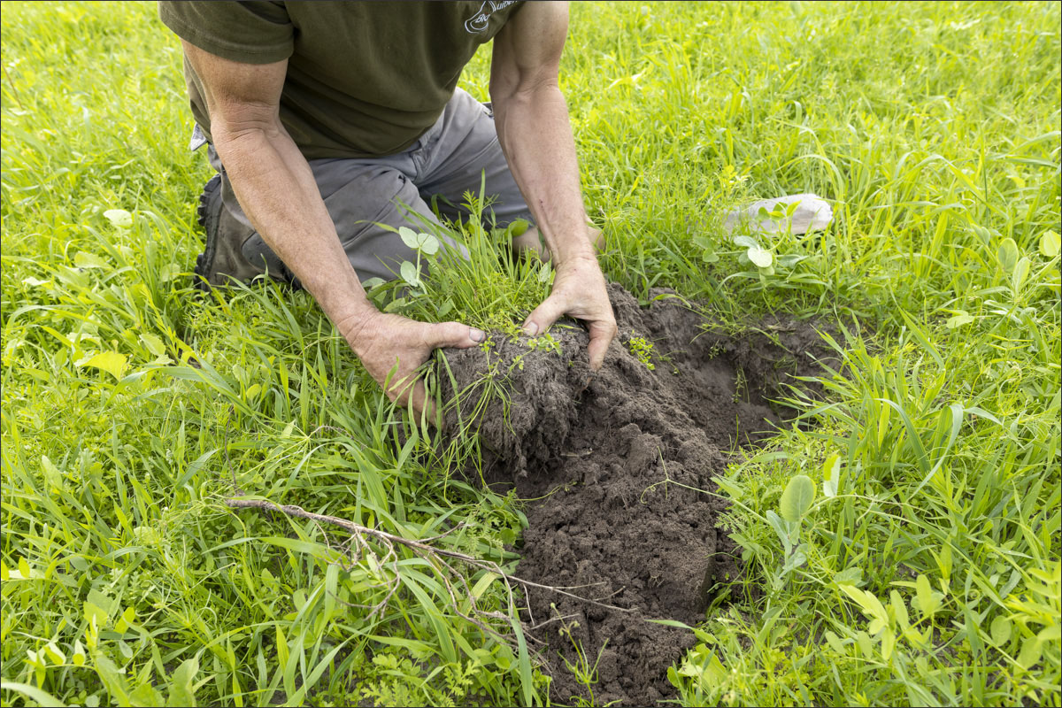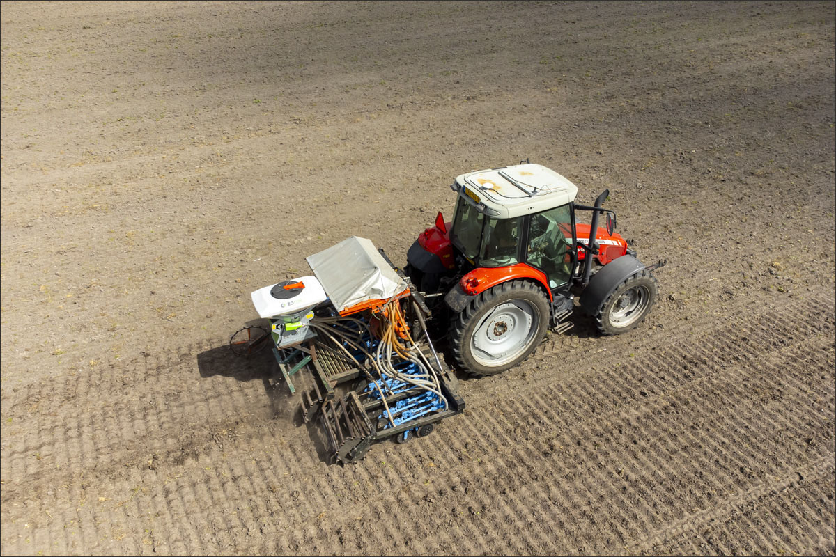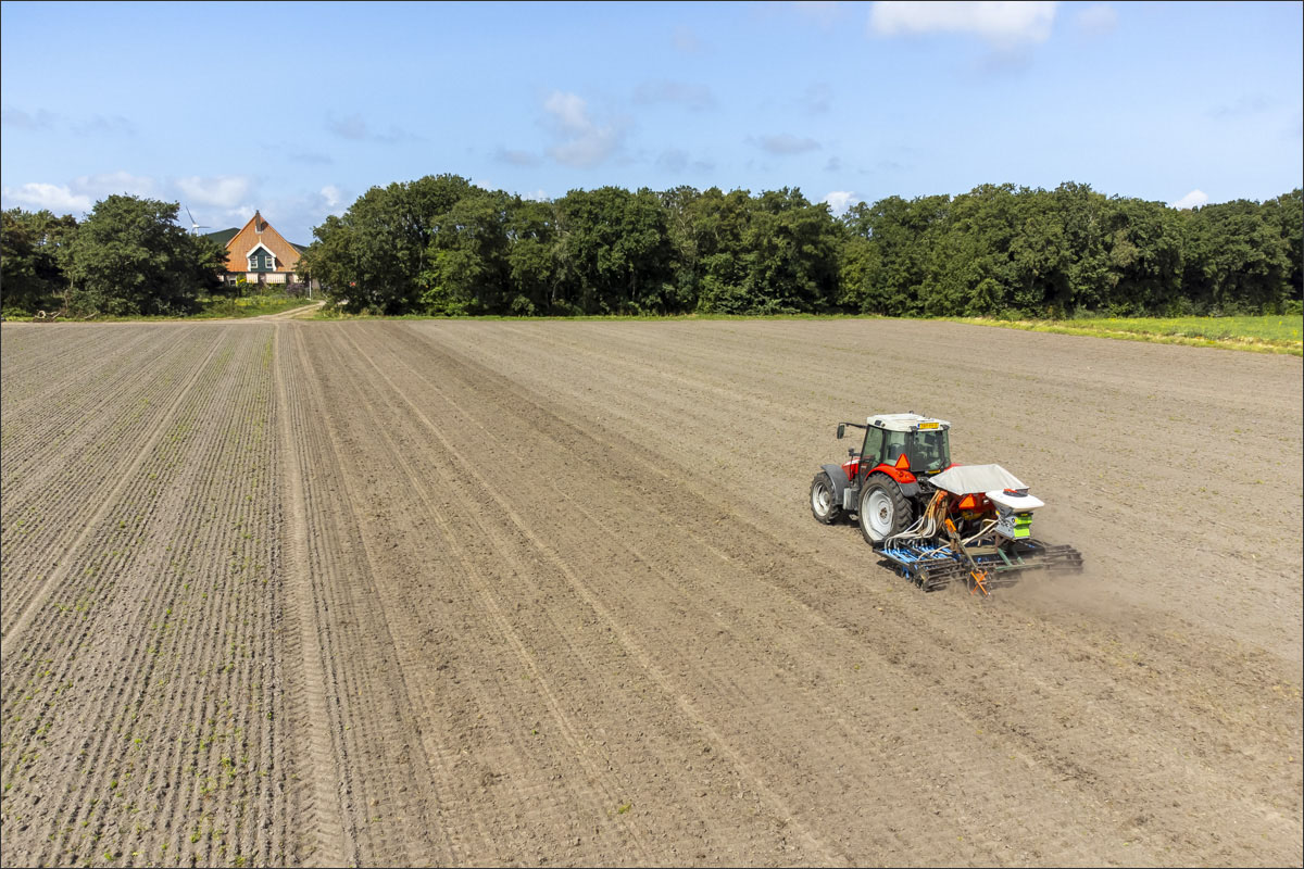 Foto’s van het bedrijf, het bodemleven, biodiversiteit op het land, de mulch-machine, bloeiende akkerranden en het inzaaien van een wintervoedselakker.